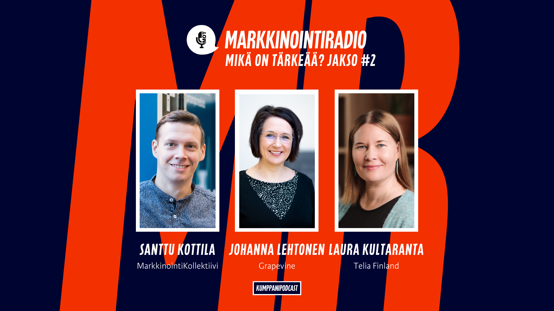 Tämän viikon jaksossa juontaja Santtu Kottilan ohella panelisteina digimarkkinointitoimisto Grapevinen Johanna Lehtonen sekä Telia Finlandin Laura Kultaranta.