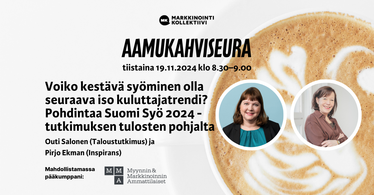 Tähän Aamukahviseuraan kannattaa tulla jokaisen markkinoijan, joka haluaa pysyä kartalla kuluttajien rahankäytön trendeistä. Toivottavasti näemme sinut linjalla mukana, lämpimästi tervetuloa!