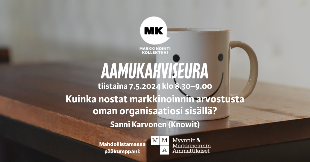 MK Aamukahviseura on MarkkinointiKollektiivin tuotannon juontama virtuaalinen aamukahvihetki, jossa jaetaan inspiraatiota vaihtuvien vieraiden kanssa markkinoinnin asiantuntijoillle. Tarjolla on rentoa keskustelua markkinoinnin alan ajankohtaisuuksista, aiheista ja ilmiöistä. Katso tallenteita aiemmista Aamukahviseuroista.