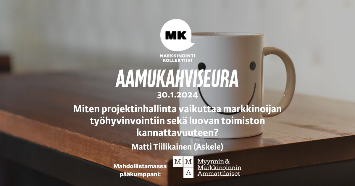 KATSO TALLENNE: MK Aamukahviseura 30.1.2024: Miten projektinhallinta vaikuttaa markkinoijan työhyvinvointiin sekä luovan toimiston kannattavuuteen? Vieraana Matti Tiilikainen (Askele)