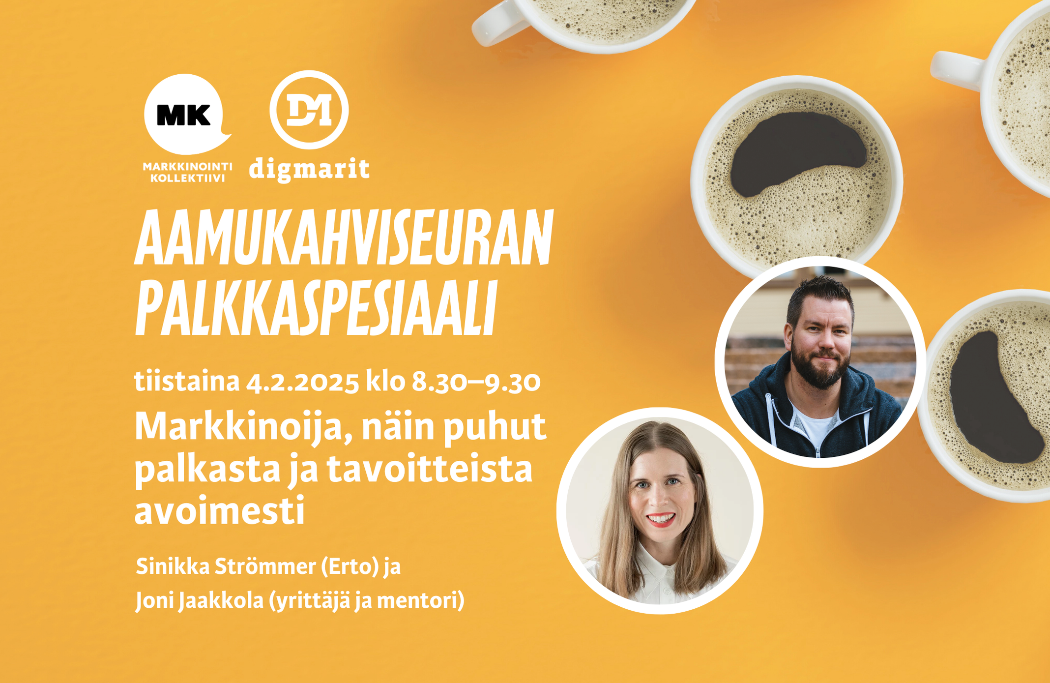 KATSO TALLENNE: MK Aamukahviseuran palkkaspesiaali 4.2.2025: Markkinoija, näin puhut palkasta ja tavoitteista avoimesti, vieraina Sinikka Strömmer (Erto) ja Joni Jaakkola (yrittäjä ja mentori)